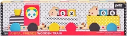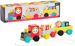 Dette moderne trætog har et lokomotiv og to vogne, fire klodser med tal og to søde dyrevenner. Børn kan trække det i snoren, bygge og omrokere klodser og figurer, mens de udvikler fantasi, logik samt fin- og grovmotorik.