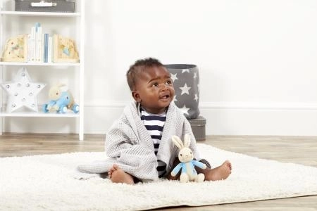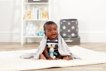 Det strikkede tæppe i ren bomuld er skånsomt mod babyens hud, åndbart og kan vaskes i maskine for nem pleje.