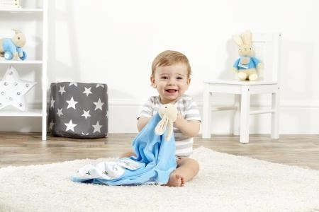 Den søde krammeklud med kaninen PETER RABBIT vil glæde enhver baby. Den er superblød, behagelig at røre ved og kan nemt foldes og sikres med en knap. Ydersiden er blå, indersiden prydet med illustrationer efter Beatrix Potter. Ideel som gave til fødsel eller dåb.