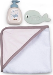- Indeholder magisk vandtermometer, flaske med pumpe og badehåndklæde.