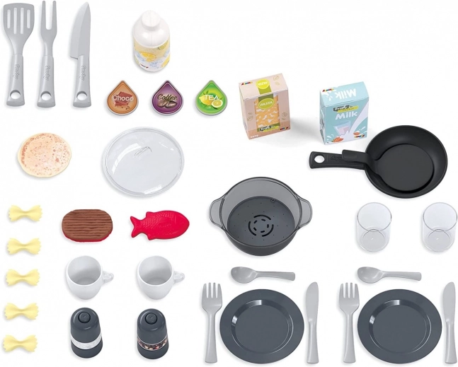 Medfølger gør et rigt sæt på 34 stykker tilbehør – gryde med låg, pandekagepande, kværn til salt og peber, service og bestik til to personer, kapsler til kaffemaskinen, køkkenredskaber, indsats til opvaskemaskine samt legevare. Drejelige kontrolknapper, åbningsbare ovn- og køleskabslåger og den karakteristiske lyd “cric cric” fra sodavandsmaskinen understøtter realistisk leg.