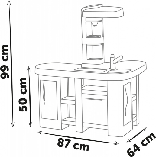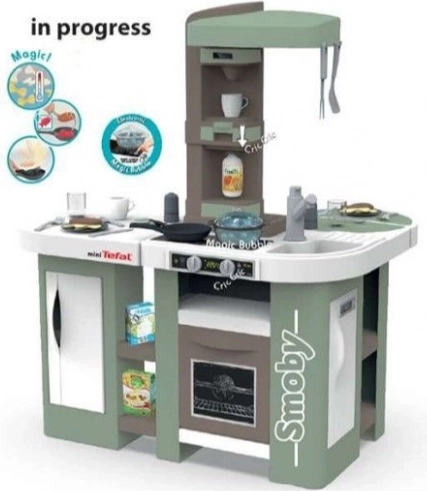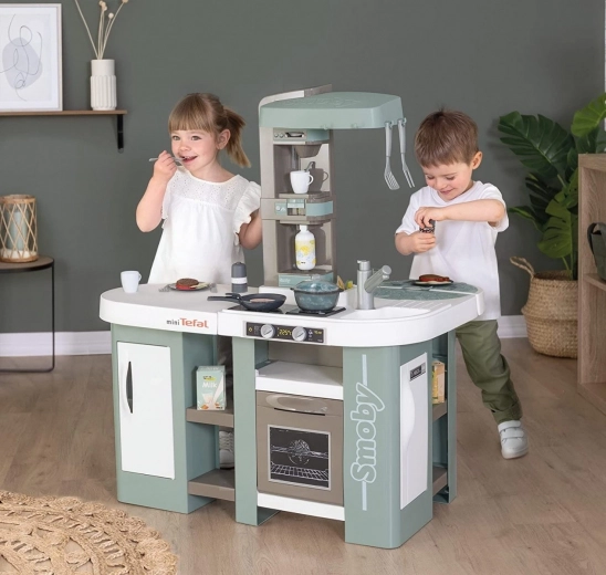 Dette rummelige køkken inspireret af TEFAL tilbyder alt til autentisk leg: bordplade, vask med armatur, kapselkaffemaskine, sodavandsmaskine, ovn, opvaskemaskine, køleskab og åbne hylder. Den elektroniske funktion magisk gryde skaber rigtige bobler efter påfyldning af vand og tryk på knappen, hvilket begejstrer enhver lille kok.