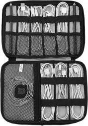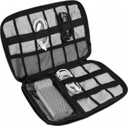 Denne grå rejseorganizer er en fremragende løsning for alle, der vil have elektronisk tilbehør lige ved hånden og perfekt organiseret. Den er lavet af slidstærk polyester og tilbyder gennemtænkte rum, elastiske stropper og netlommer til sikker opbevaring af kabler, opladere, powerbanks, USB-flashdrev og hukommelseskort. Kvalitetslynlåsen beskytter indholdet under transport.