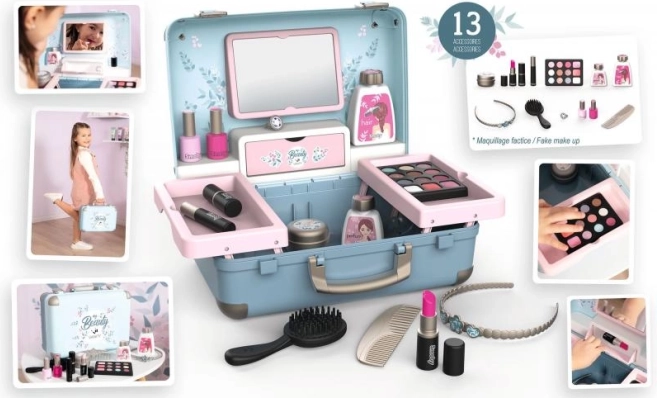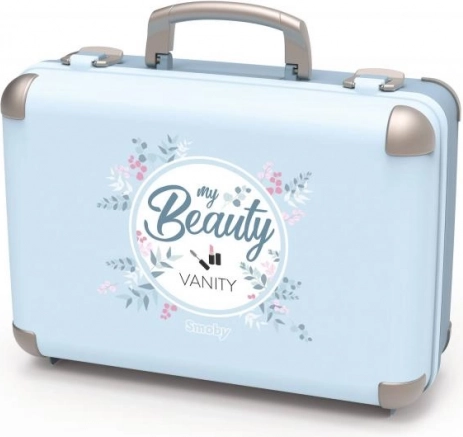 Opdag magien ved at lege skønhedssalon med kosmetisk kuffert My Beauty Vanity. Denne smukke og funktionelle kuffert indeholder 13 efterlignede kosmetikprodukter såsom læbestifter, neglelak, øjenskygger, mascara og mere. Der er også en kam, et pandebånd og forskellige flasker.