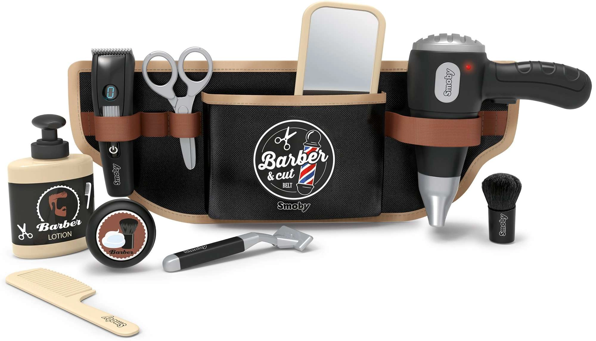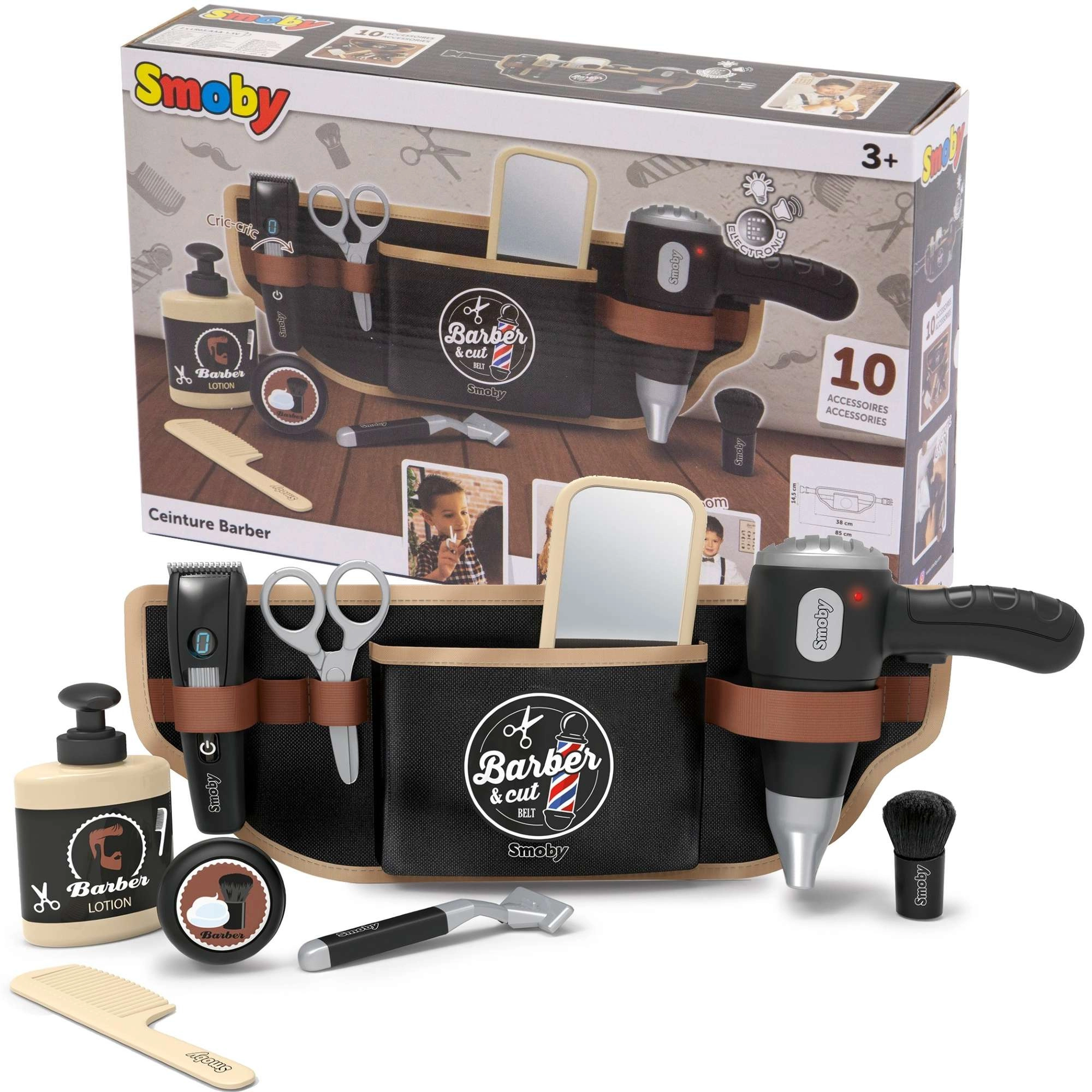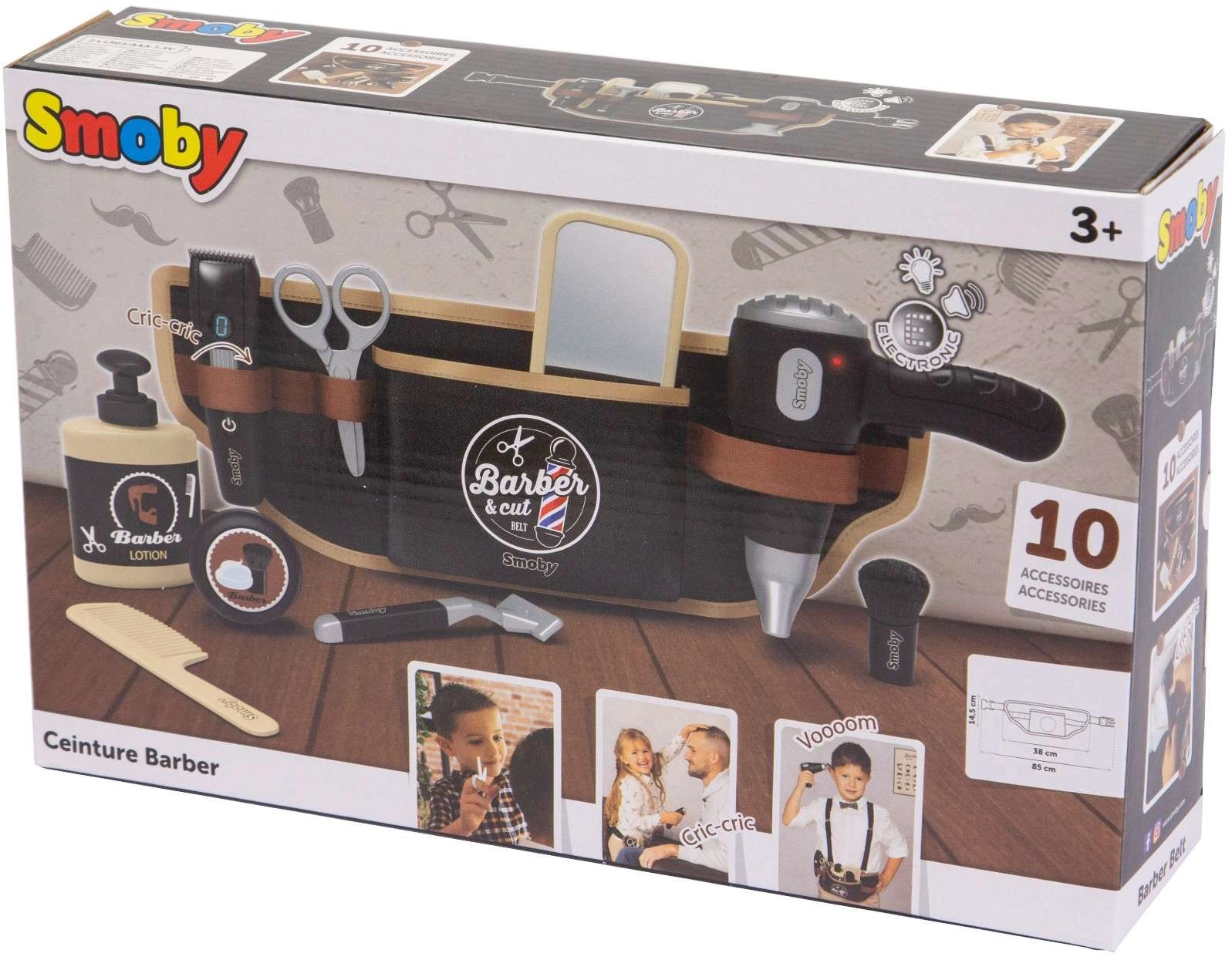 Frisørbæltet til børn Smoby myBeauty forvandler hver dag til et sjovt salon-eventyr. Med det justerbare bælte har børnene alle redskaber sikkert opbevaret og altid ved hånden – fra hårtørrer og saks til kam og barbermaskine. Den interaktive hårtørrer afgiver realistiske lyde, så legen føles helt ægte.