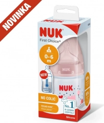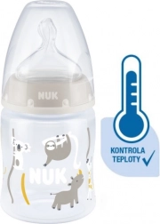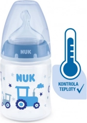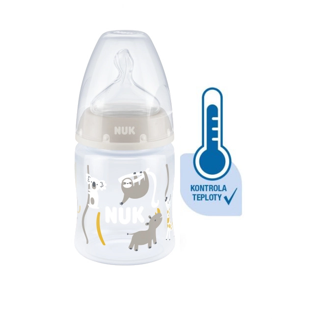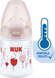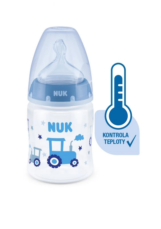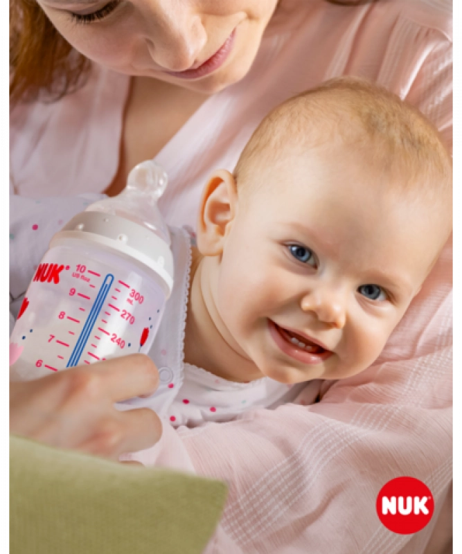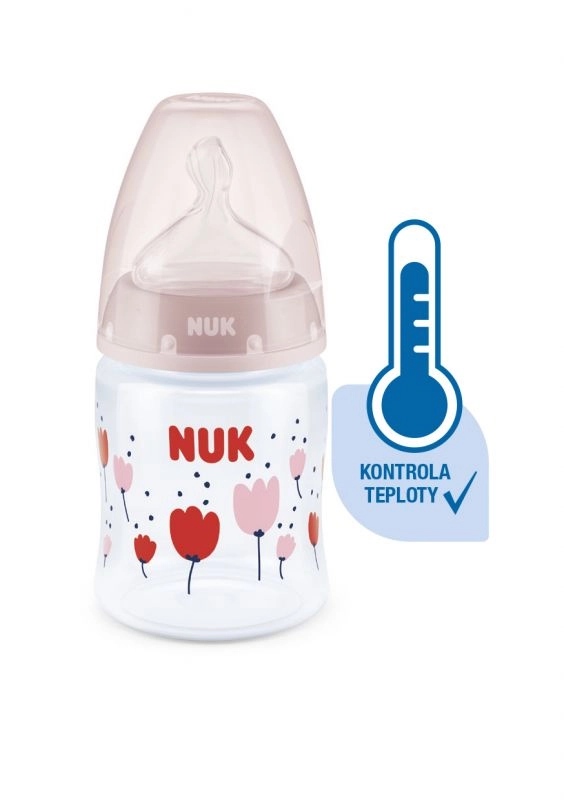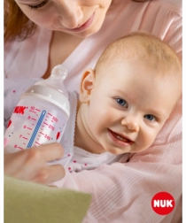 Temperaturkontrol hjælper forældre med at opnå den optimale temperatur og dermed sikre en tryg og sikker madning af deres barn. Rolig og sikker madning takket være temperaturkontrollen. Når barnet er sultent, bør maden i flasken hverken være for varm eller for kold. Derfor kontrollerer mødre og fædre temperaturen før hvert måltid. Det er ikke altid let at vide, hvornår maden har den rette temperatur. Derfor er NUK First Choice+ sutteflasker udviklet med temperaturkontrolfunktion. Denne funktion har ikke tidligere været præsenteret på denne måde. NUK First Choice+ sutteflasker er nu udstyret med en ny temperaturindikator, som hjælper med at undgå, at dit barn drikker for varm mad. Indikatoren ligner et termometer, er placeret mellem skalaerne, og flaskens indholdstemperatur ændrer dens farve. Denne funktion hjælper forældre med at opnå den optimale temperatur ved madning af deres barn. Hvis maden er for varm, skifter den blå indikator til hvid. Ideelt set bør maden have kropstemperatur (37 °C), hvilket svarer til blå farve på displayet. Bemærk: Temperaturkontrollen er beregnet som ekstra kontrol. Før madning skal temperaturen også kontrolleres manuelt. For at kontrollere temperaturen anbefaler vi at dryppe et par dråber af flaskens indhold på indersiden af håndleddet. Den mest naturlige sut for dit barn. First Choice-flasker har i mange år været førstevalget til flaskemadning med inspiration fra amning. Med First Choice+ er vi kommet endnu tættere på naturen – de muliggør sund kæbeudvikling, og barnet føler, at det drikker fra moderens bryst. Naturligt og korrekt formet til kæben. Den unikke form på NUK-sutterne er modelleret efter moderens brystvorte under amning. Sutten giver tilstrækkelig plads til de naturlige sugebevægelser i barnets tunge og kæbe. Blød som moderens bryst. Silikonesutten er takket være den nye bløde zone endnu bedre formet til ganen i dit barns mund og giver en naturlig drikkefornemmelse. Forebygger kolik. Det forbedrede Anti-Kolik Air System sikrer et jævnt flow af væsken uden luftindtag. Klinisk testet. Takket være suttes form, der er usædvanligt naturlig, accepteres den meget godt af børn. Det betyder, at den er særligt velegnet til børn, der både ammes og får flaske samtidig. Sutteflaske. Praktisk NUK-temperaturdisplay, der skifter farve fra blå (kold) til hvid (for varm) fri for skadelige stoffer og lugt – indeholder ikke BPA let at fylde og rengøre – ekstra bred flaskemund sikker greb og stabilitet – takket være den let ergonomisk formede flaske og brede bund ubegrænsede kombinationsmuligheder – kompatibel med alle NUK First Choice produkter. Videnskabelig undersøgelse: Moral m.fl. BMC Pediatrics 2010, 10:6. Flere oplysninger findes på http://nuk.com/research. Uafhængig markedsundersøgelse med 205 børnelæger, Tyskland 2018. 99 % af mødre bekræftede, at NUK First Choice+ Control-flasken ikke forårsager kolik. Hovedegenskaber: flaskens indholdstemperatur ændrer farve: hvis maden er for varm, skifter den blå indikator til hvid ideel til barnets kæbe, sut af ekstra blød silikone, 0–6 måneder M (medium åbning = til babymad) klinisk testet: til optimal kombination af amning og flaskemadning attraktivt design