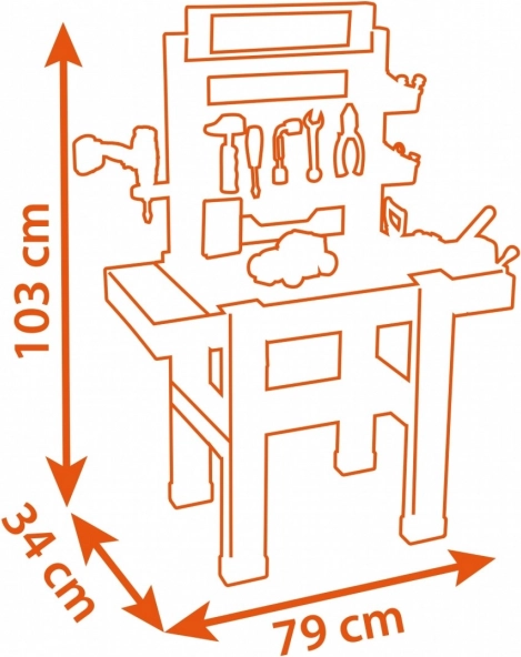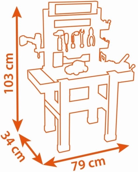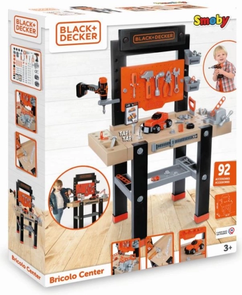 Den store børne-arbejdsbænk BLACK+DECKER Bricolo Center fra Smoby giver et realistisk værksted med 92 dele. Her finder du en mekanisk boremaskine, skruestik, skruetrækkere, hammer, sav, tang samt en bil, der kan samles. Den stabile konstruktion, praktiske opbevaringsløsninger og mål på 103 × 79 × 34 cm understøtter udviklingen af motorik og kreativitet hos børn fra 3 år.