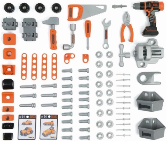 - Arbejdsbænk, mekanisk boremaskine/skruemaskine, skruetrækker, hammer, sav, tang, nøgle, skruestik, skruer, møtrikker, søm, konstruktionslister, bil til samling, 2 kurve, 2 sidefløje