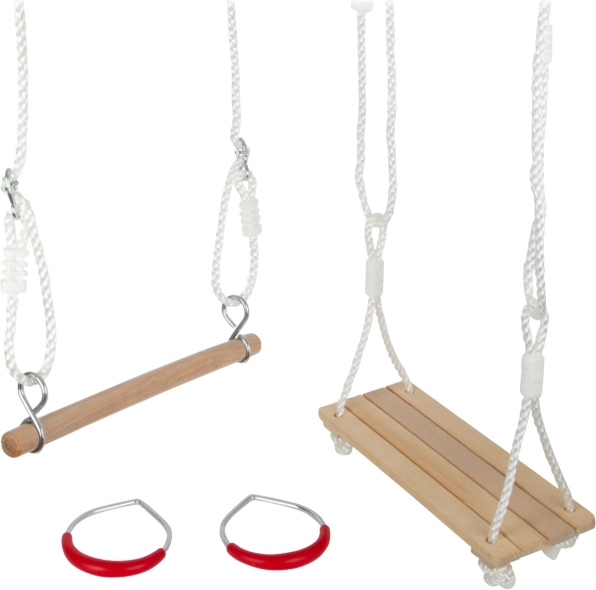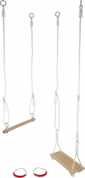 Dette multifunktionelle sæt til små akrobater bringer aktiv bevægelse og glæde til både haven og børneværelset. Den klassiske trægynge, den hængende barre og gymnastikringene med komfortable plastgreb understøtter udviklingen af koordination, styrke og balance.