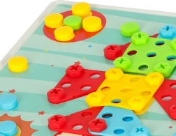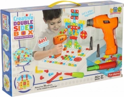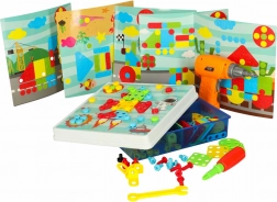 Byggesættet med mosaikplade lader børn ved hjælp af legetøjsboremaskine, skruetrækker og nøgle skrue farvede skruer fast og skabe alsidige billeder og rumlige modeller. Væk barnets fantasi – den eneste grænse er den lille konstruktørs forestillingsevne.