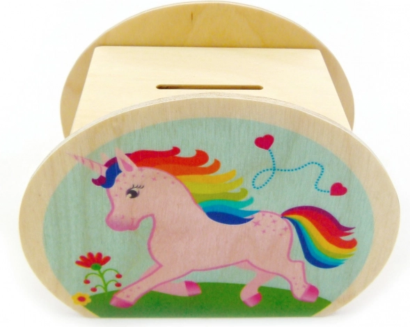Denne farverige sparebøsse med enhjørning motiverer børn til økonomisk forståelse og til at lære værdien af penge. Den robuste udførelse i naturligt træ sikrer lang holdbarhed og et behageligt, naturligt udtryk, der passer flot på børneværelset.