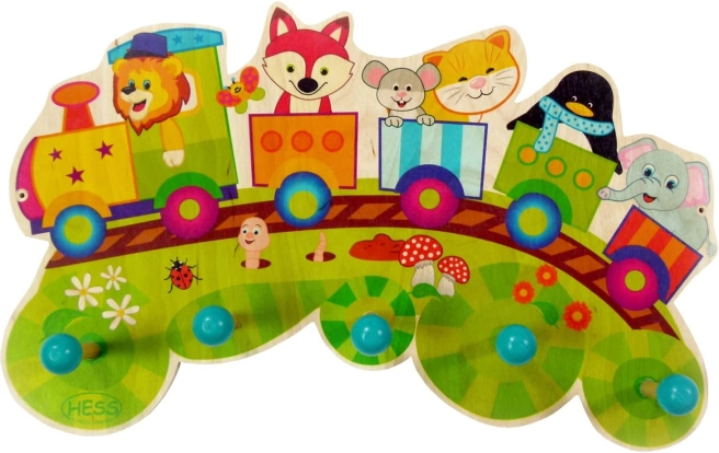 Fængende farverig knagerække til børneværelse eller gang med togmotiv og fem kroge til ophæng af tøj. Fremstillet af miljøvenligt træ, der er brugt økologiske farver.