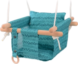 Tekstilgynge til de mindste af blød 100% bomuld og solidt træ, som giver behagelig gyngetur både inde og ude. Takket være bæreevne på 50 kg, højdejusterbare reb (maks. 180 cm) og 2 karabinhager hænger du den nemt op og tilpasser den. Den stilfulde turkise farve og den robuste trækonstruktion vil glæde små opdagelsesrejsende.