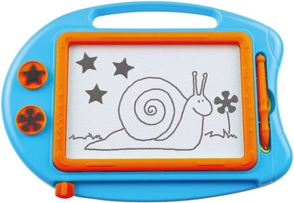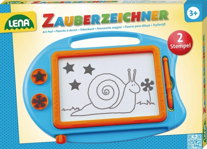 Den magnetiske tegnetavle LENA er et fremragende legetøj for små kunstnere. Børn kan skrive, tegne og stemple igen og igen – uden rod og uden papir. Den medfølgende pen er solidt fastgjort med en snor, så den ikke bliver væk, og den glidende skyder sletter billedet hurtigt.