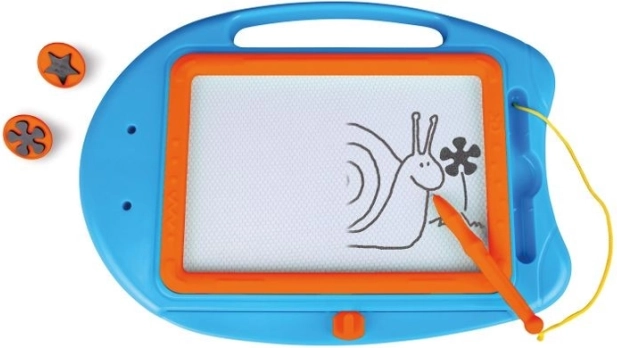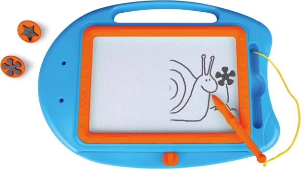 Den magnetiske overflade gør det muligt for børn at tegne, skrive og stemple uden papir og farver. Billedet slettes med ét træk, og så kan man skabe igen.