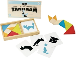 Denne kvalitets-tangram fra Jeujura udvikler børns logiske tænkning, fantasi og finmotorik. Takket være de solide træbrikker og kortene med skabeloner kan børn lægge både simple og mere udfordrende figurer eller skabe efter egen fantasi. Trææsken med serigrafi holder det hele pænt samlet.