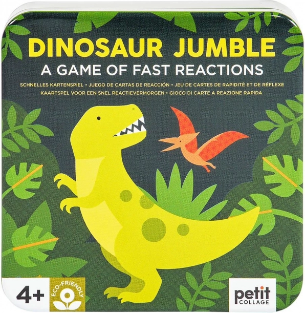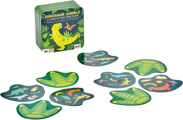 Træn din opmærksomhed med dinosaurer. Dette kortspil tilbyder op til fem varianter af regler og er fyldt med farverige illustrationer med dinosaurtema. Du vil sikkert hurtigt synes om det også på grund af dets kompakte format, så det er velegnet til spil derhjemme og på farten. Pakket i en metaldåse uden brug af plastik. Hovedegenskaber for 2–6 spillere 5 varianter af regler praktisk emballage Spilvejledning: Grundvariant: Giv hver spiller ét kort med forsiden nedad. Læg bunken vendt med forsiden opad mellem spillerne. På et aftalt signal vender spillerne deres kort. Den spiller, der først melder et identisk symbol på sit kort og kortet i bunken, tager kortet fra bunken. Sådan spilles bunken igennem, og vinderen er spilleren med flest kort. Omvendt variant: Del kortene mellem spillerne, så alle har samme antal kort, og ét kort bliver til overs. Spillerne lægger deres kort i en bunke foran sig med forsiden nedad. Læg det overskydende kort med forsiden opad mellem spillerne. På et aftalt signal vender spillerne det øverste kort i deres bunke. Den, der først melder et symbol, der er identisk på eget kort og kortet mellem spillerne, lægger sit kort over i bunken i midten og vender derefter sit næste øverste kort. Sådan fortsætter spillet, indtil den sidste spiller stadig har kort tilbage, og bliver dermed taber. Den spiller, der først slap af med alle sine kort, er vinderen. Gruppevariant: Spilles i runder. I hver runde deles der ét kort ud med forsiden nedad til hver spiller. På et aftalt signal vender spillerne deres kort, og den, der først navngiver og melder et symbol, der er identisk med symbolet på en anden spillers kort, giver sit kort til denne spiller. Sådan fortsætter spillet, indtil én spiller modtager alle de kort, der er delt ud i den pågældende runde. Målet er at komme af med kort; den spiller, der i alt modtager flest kort over runderne, er taberen. Mål på emballage: 10 × 10,5 × 5 cm Alder: 4+ Materiale: metal, papir Antal dele: 31 stk