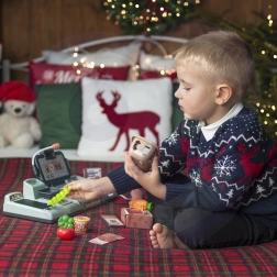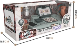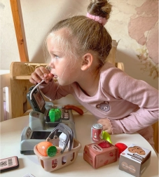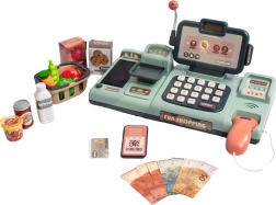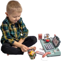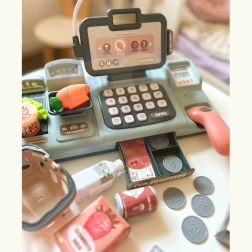 Kasseapparatet inkluderer terminal, der gør det muligt for barnet at foretage betalinger med kontanter, kort eller smartphone, ligesom voksne i butikker. Integreret vægt og bevægelig bånd giver barnet mulighed for at arrangere indkøb og opleve rollen som sælger.