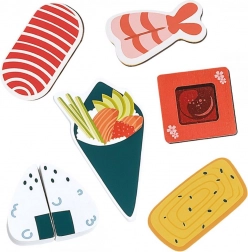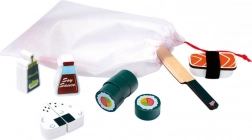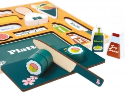 Sættet inkluderer trækomponenter som sushi, saucer, bestik og en kniv til "skæring", hvilket muliggør realistisk og kreativ leg. Dette spil er egnet til børn fra 36 måneder, men overvågning fra en voksen anbefales til børn under 3 år.