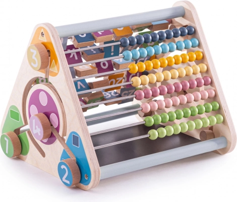 Opdag et sjovt og sikkert læringslegetøj til børn fra 3 år – en træaktiv trekant af 100% FSC-træ uden aftagelige dele. Den tilbyder 5 aktivitetsflader, der udvikler finmotorik, koncentration og de første færdigheder: fra kugleramme over drejelige klodser med alfabet og dyr til en kridttavle. Malet med ikke-giftige farver og opfylder europæiske sikkerhedsstandarder.