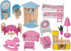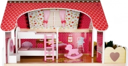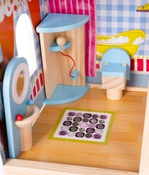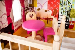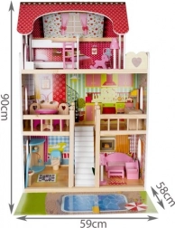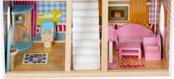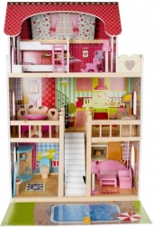 Trædukkehuset er et fantastisk legetøj, der udvikler børns kreativitet og sociale færdigheder. Det har tre niveauer forbundet med smukke hvide trapper og indeholder i alt fem værelser, en balkon og en have med pool. Det er udstyret med forskellige farverige og behagelige elementer, der sikrer lang tids sjov.