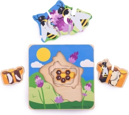Den lagdelte konstruktion med gradvist skiftende billeder viser de enkelte udviklingsfaser – fra æg til voksen bi. Brikkerne er tilpasset børnehænder, og den solide udførelse tåler hyppig brug.
