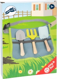 Skovl, rive og spade i børnestørrelse er lavet af robust metal. Glatte træhåndtag ligger godt i små hænder og støtter et sikkert greb.