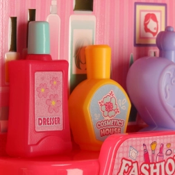 Der medfølger kamme, spejl, flasker, hårtilbehør og andre rekvisitter til realistisk leg som frisør og i kosmetiksalon.