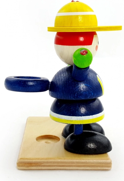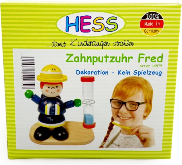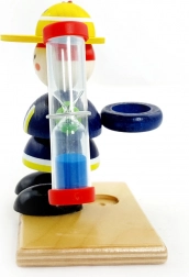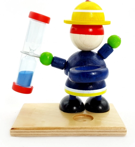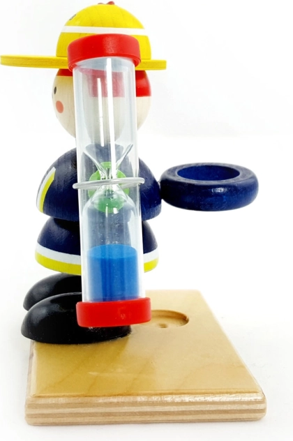 Denne farverige trælegetøjsfigur, som holdes af en brandmand, er ikke kun dekorativ, men også funktionel. Timeglasset kan bruges som en original timer med blåt sand og fungerer som et legende element på børneværelset. Med en løbetid på 2 minutter er det ideelt til at motivere til tandbørstning.