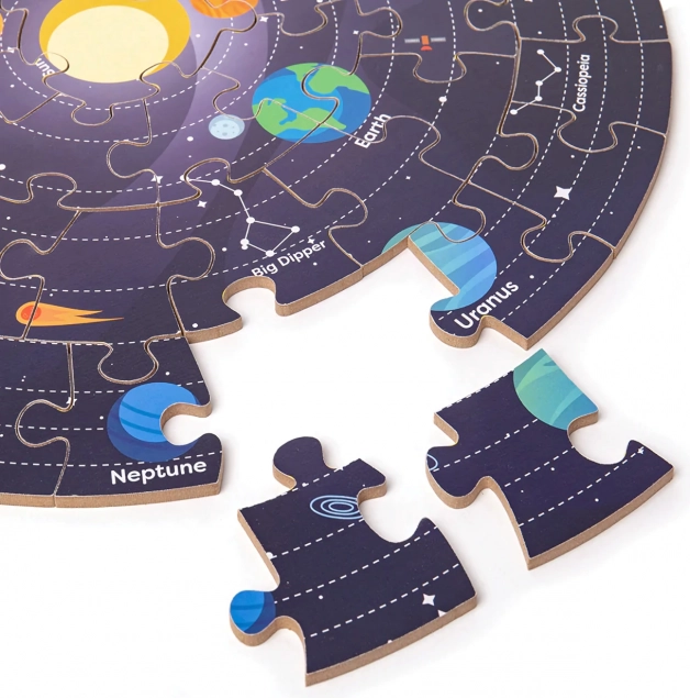 Produktet kombinerer leg og læring, da hver samling af brikkerne udvikler kognitive evner og viden om solsystemet. Puslespillet er lavet af materialer af høj kvalitet fra ansvarlige kilder, som opfylder strenge europæiske sikkerhedsstandarder.