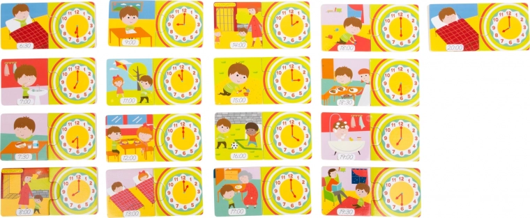 Hvad er klokken? Ved hjælp af søde billeder af daglige aktiviteter lærer børn legende at kende klokken med dette spil. Der skal altid samles to dele. Spillet kan også bruges som vendespil. Det lærer ikke kun tiden, men støtter også finmotorik og kommunikation. Et fremragende læringsspil, som virkelig er sjovt for alle. Vigtigste egenskaber: lærer at kende klokken, kan også bruges som vendespil, træner motoriske færdigheder