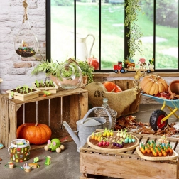 Den robuste træbund og gulerødder af træ og filt sikrer holdbarhed og et smukt naturligt udtryk, som indbyder børn til leg.