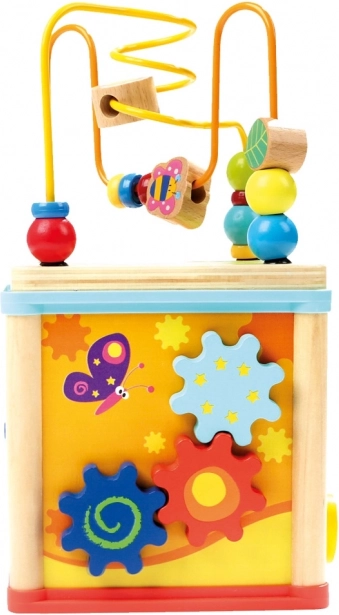 Opdag et sjovt og lærerigt legetøj til de mindste: en motorisk træ-kube med ur, perlelaboratorie og aktiviteter på hver side. Understøtter finmotorik, logisk tænkning, genkendelse af farver og former samt hånd–øje-koordination.