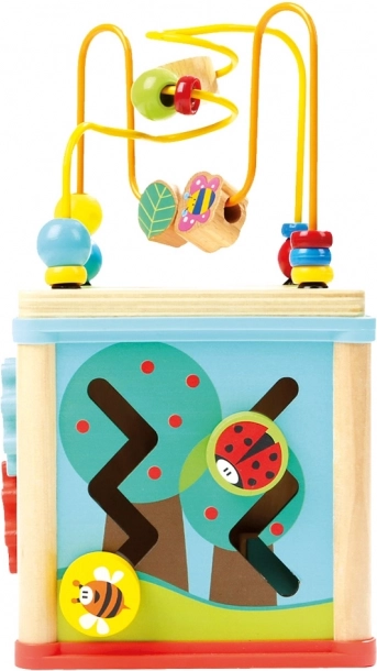 Denne farverige motoriske træ-kube tilbyder børn fra 12 måneder mange måder at lege og samtidig lære på. Med uret og visere lærer børn på en legende måde om tid, perlelaboratoriet udvikler greb og koordination, og de øvrige sider træner logik, former og farver.