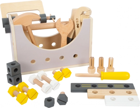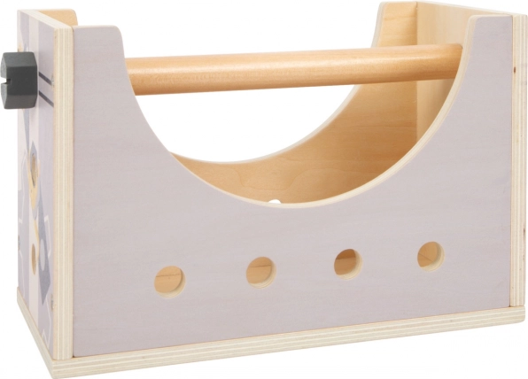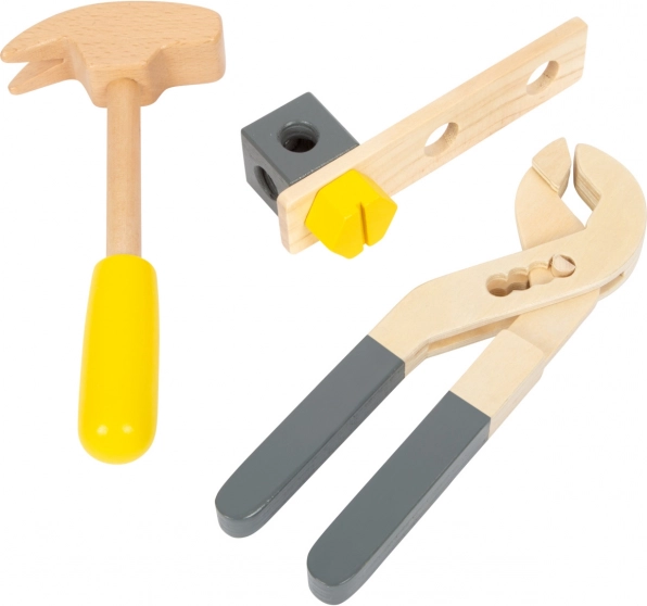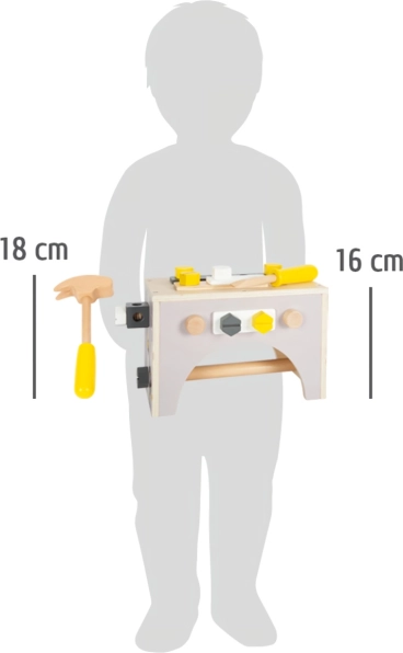 Hammer, nøgle, skruetrækker, rørtang og skruestik – alt i robust træ. Børn kan afprøve grundlæggende “håndværks”-færdigheder gennem leg.