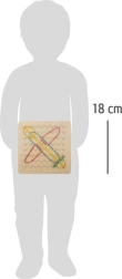 Trætavle Geoplan er udstyret med 64 jævnt fordelte knopper på en solid træbase med mål 18 x 18 x 2 cm. Med 48 farverige elastikker kan børn skabe et uendeligt antal mønstre og figurer fra simple geometriske former til komplekse kompositioner. Sættet inkluderer også 23 mønsterkort, der hjælper med at øve rumlig planlægning og logisk tænking.