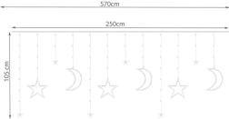 Specielle LED-dioder forbruger betydeligt mindre energi og udstråler ikke varme, hvilket gør dem energibesparende med en levetid på op til 35.000 timer. Den samlede længde af gardinet er 570 cm, med en variabel længde af hængende strenge 105/80/45 cm. Produktets vægt er 0,55 kg (inklusive emballage 0,62 kg), hvilket gør det let og nemt at montere.