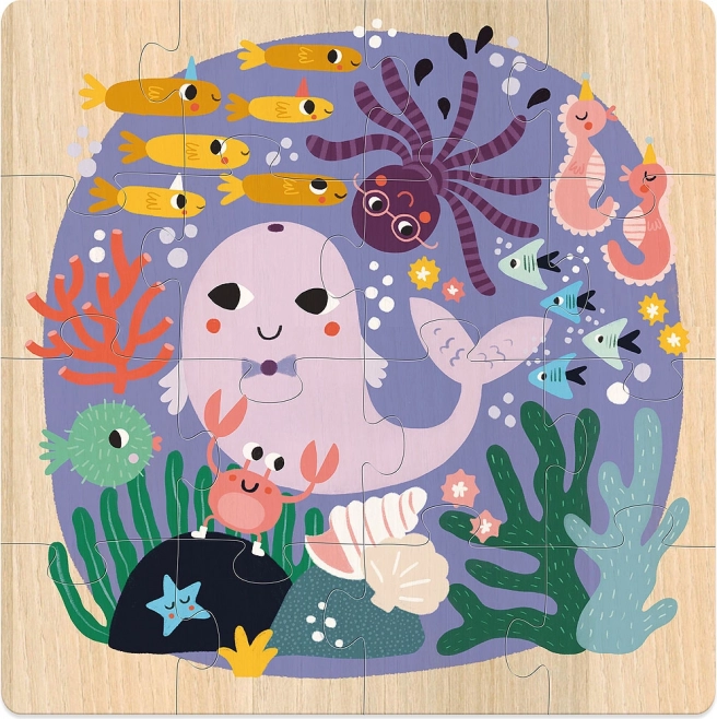 Oplev naturens vidunderlige verden gennem dette sæt træpuslespil. Hvert af de tre billeder viser et forskelligt tema: leg blandt skyerne, den undersøiske verden og eventyr i junglen. Scenen på himlen glæder med en smuk påfugl, en ørn og andre fugle. Havmotiverne vækkes til live af en stor hval, en blæksprutte og venlige fisk. Land-scenen omfatter en tiger, en krokodille og en papegøje i et lyst og muntert junglemiljø.