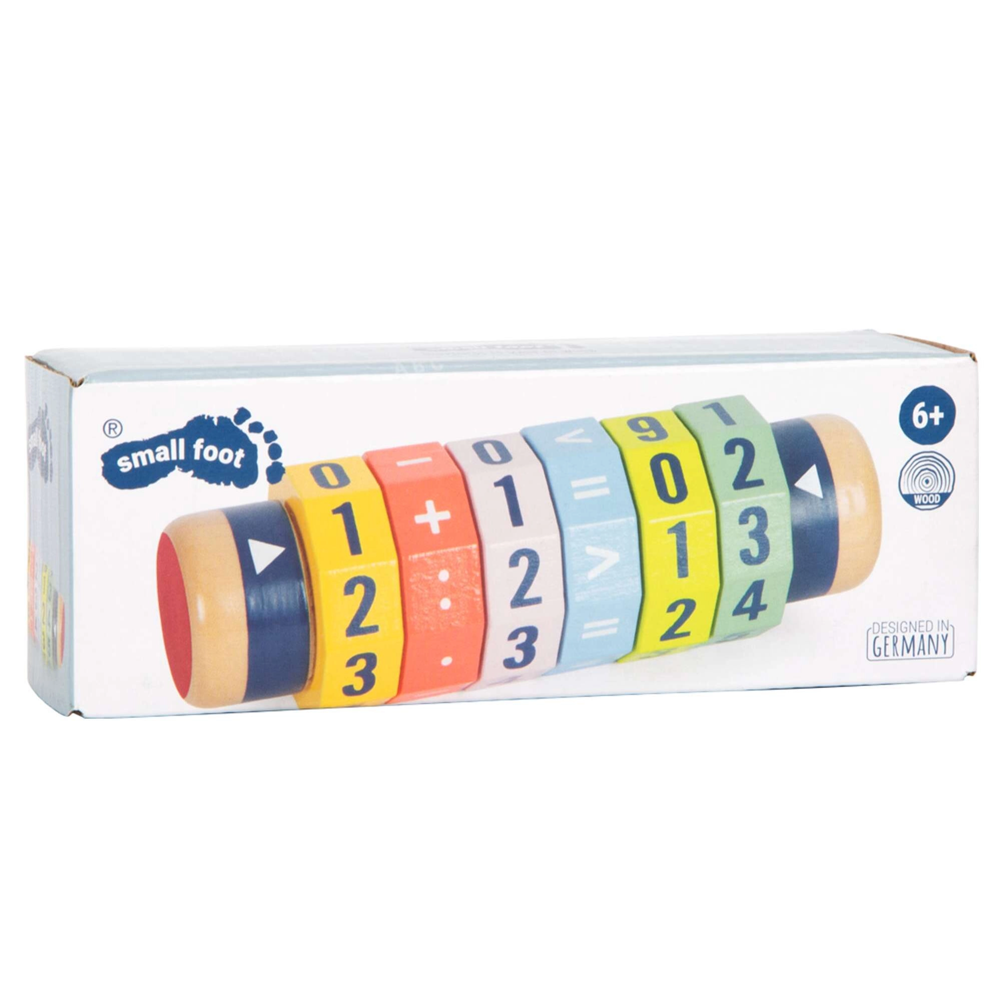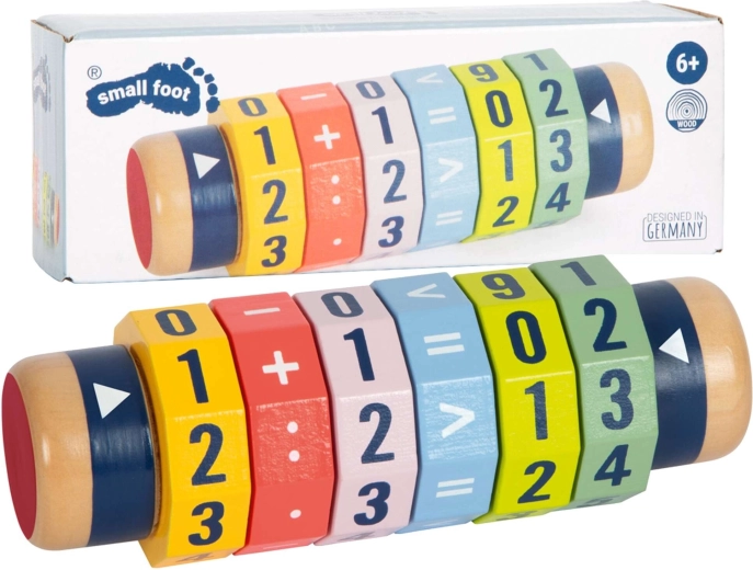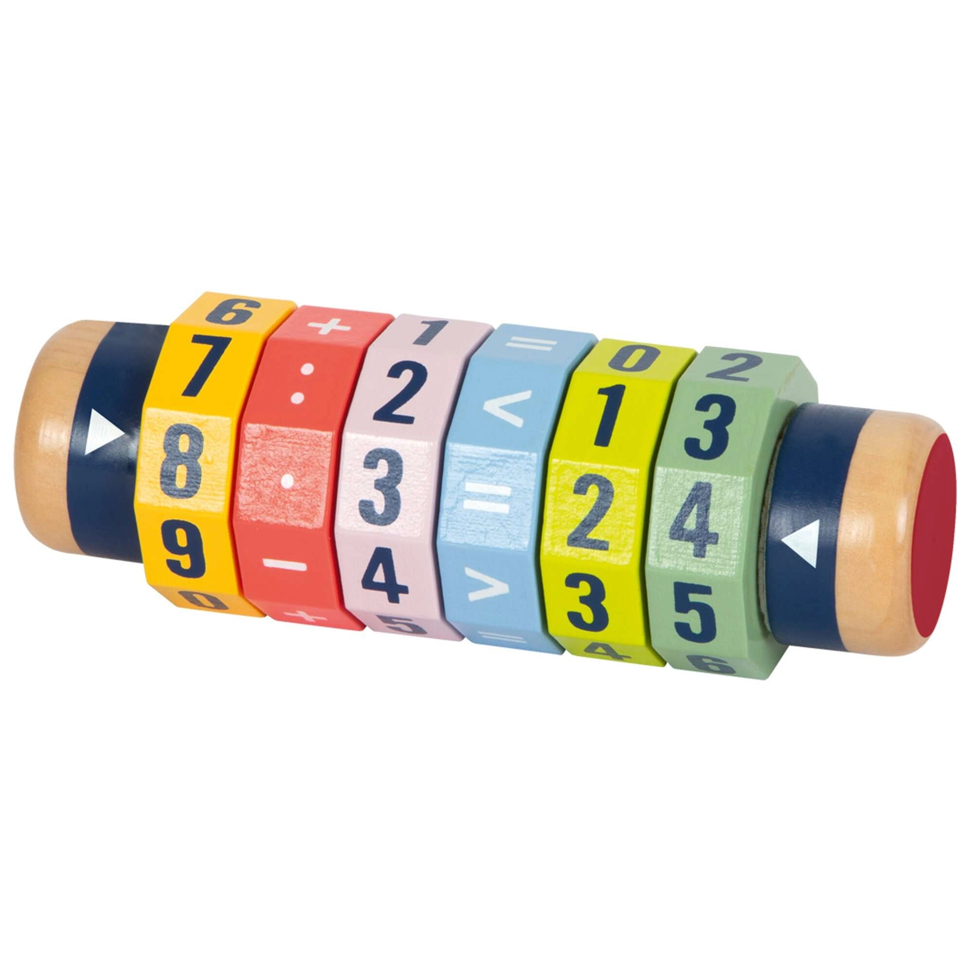 Opdag en sjov vej til matematik. Træcylinderen med seks roterende ringe gør det muligt for børn at skabe både simple og mere avancerede ligninger og tal-sammenligninger. Takket være de klare farver og de tydelige tal lærer børn gennem leg og styrker finmotorik samt koncentration.