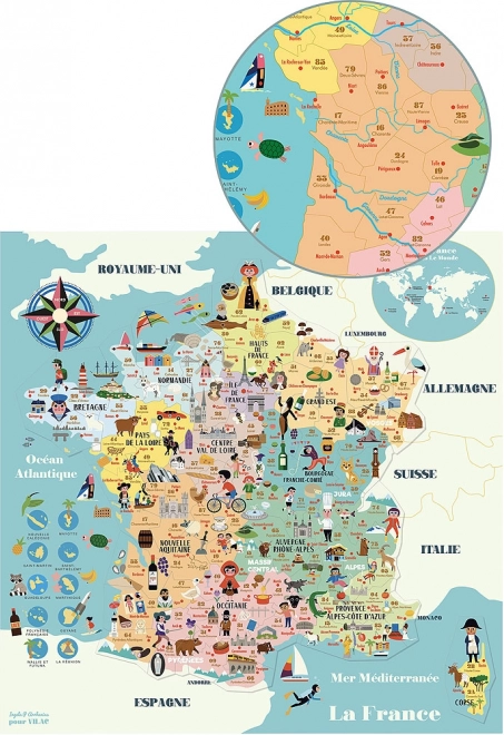Dette stilfulde magnetiske kort over Frankrig er ideelt til børneværelset og legeområdet. Takket være de robuste træbrikker og den overskuelige udformning tilegner børn sig viden om franske regioner, byer, seværdigheder, bjerge, floder og kystlinje. Der mangler heller ikke referencer til gastronomi, vinområder og champagne, som giver kortet autenticitet.