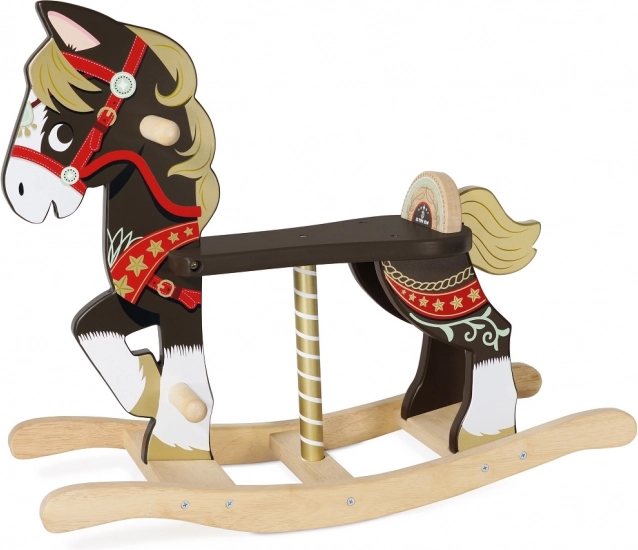 Giv børn tidløs glæde med den træ-gyngehest fra Petilou-kollektionen. Den robuste konstruktion, glatte kanter, støttehåndtag og komfortable sæde sikrer både sikkerhed og komfort under legen. Det elegante design med brune og gyldne accenter pynter på ethvert børneværelse.
