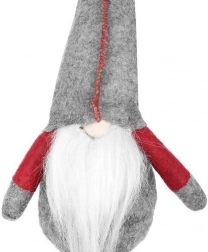 Den tekstile dekorationsnisse i grå-rød udførelse har en klassisk høj spids hue, lange stribede ben og et blødt hvidt skæg. Takket være den særlige bagprofil sidder den stabilt på kanten af et bord eller en hylde og giver interiøret et varmt og hyggeligt udtryk.