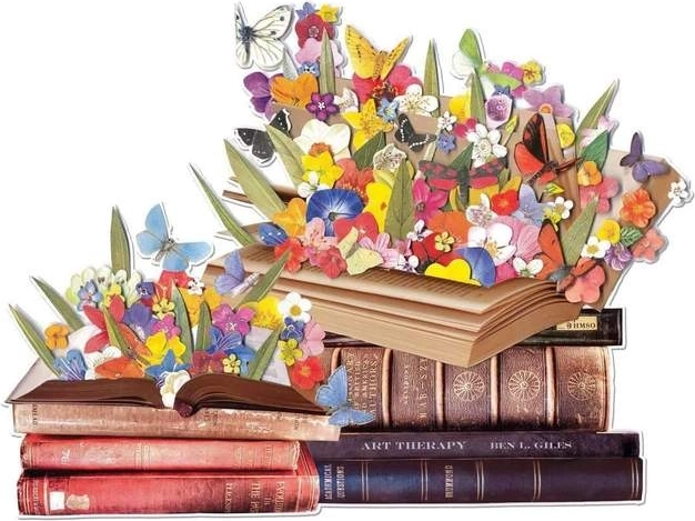 Dyk ned i en kreativ verden, hvor litteratur møder natur. Kunstneren Ben Gilles har givet motivet af blomstrende bøger et legende collageudtryk, farver og lys, hvilket skaber en helt særlig atmosfære. Det færdige puslespil er unikt formet og kontureret helt ud til motivets kanter, så hver detalje træder frem.