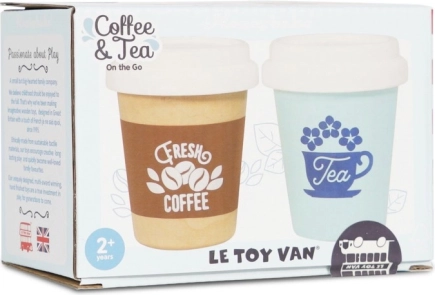 Stilfuldt legetøjssæt med to bægre til kaffe og te to-go fra LE TOY VAN til realistisk rolleleg. Fremstillet af FSC-træ, uden plast og malet med giftfri vandbaserede farver. Perfekt til lejeboligens legekøkken og butiksleg, stimulerer kreativitet og sociale færdigheder.