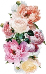 En rig komposition af pæonblomster i pastelfarver giver det færdige billede en subtil elegance og et dekorativt udtryk.