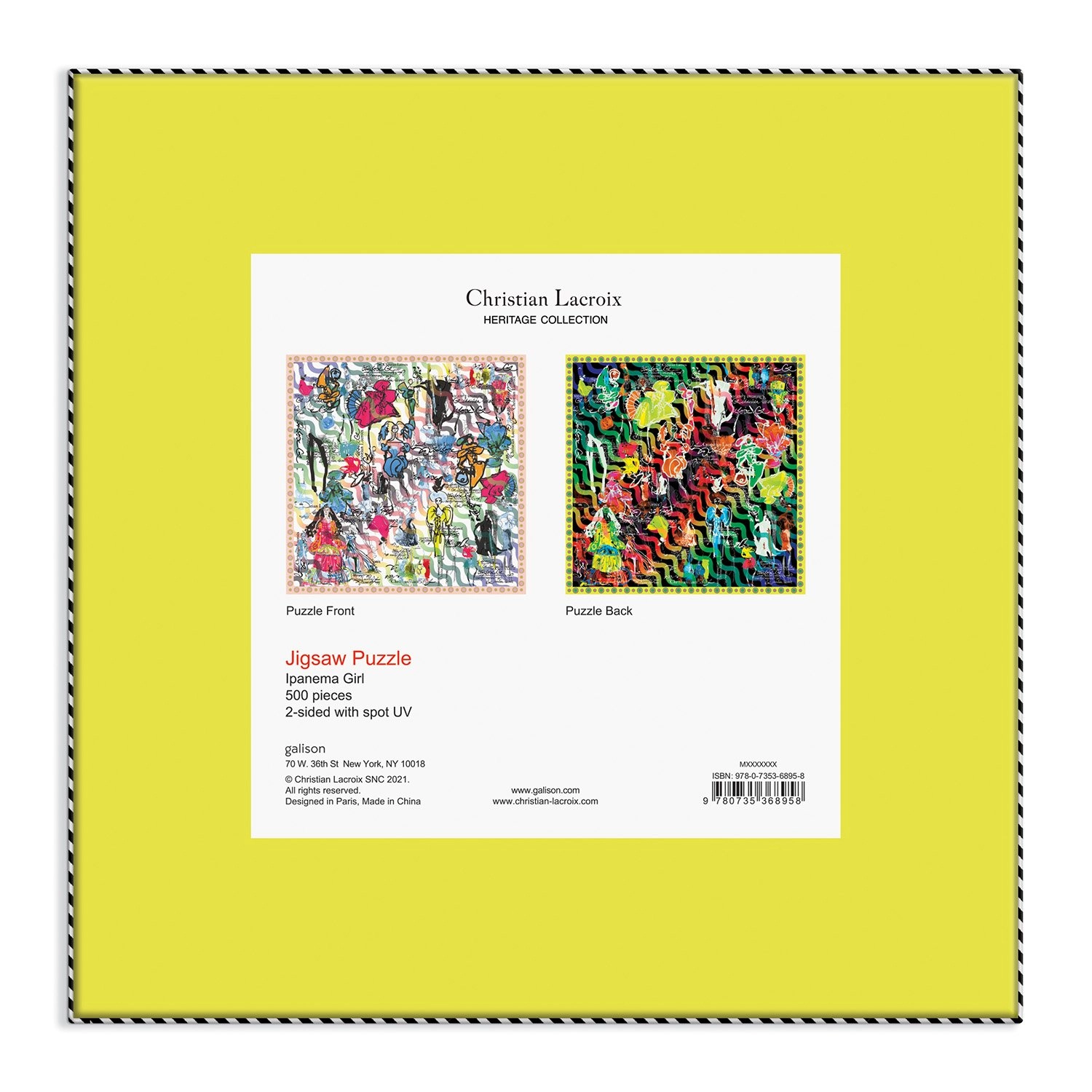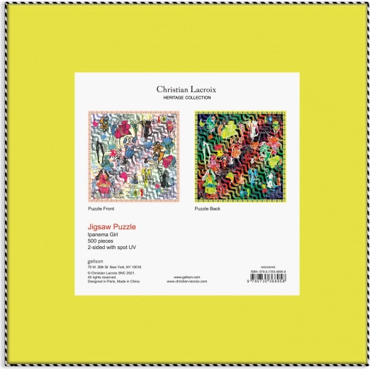 Oplev det enestående dobbeltsidse puslespil Ipanema Girls fra Galison med det ikoniske design af CHRISTIAN LACROIX. Hver brik imponerer med præcision og en kvalitetsfinish, der adskiller siderne i blank og mat. Ideelt til alle, der elsker design, mode og udfordringer.