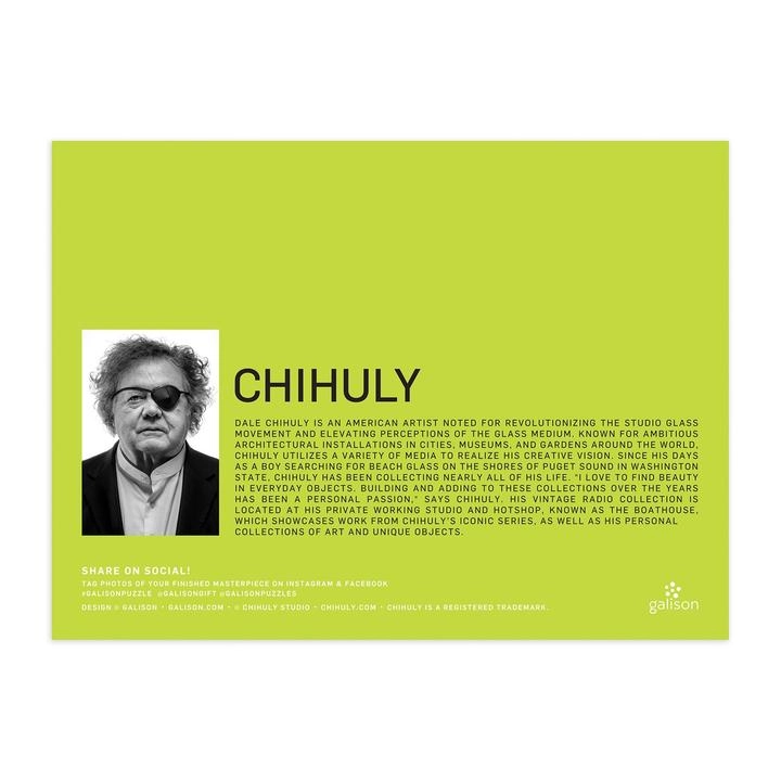Stilfuldt puslespil med motiv af vintage bærbare radioer, der vil glæde både designelskere og samlere. Kunstneren Dale Chihuly fandt inspiration i sin livslange samling, hvilket resulterede i et billede fyldt med detaljer og farver. Kvalitetstryk og robuste brikker af genbrugspapir sikrer en behagelig oplevelse ved hver samling.