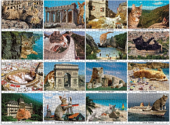 Humoristisk puslespil med katte på ferie bestående af 1500 brikker, der tilbyder underholdning og afslapning. Indeholder seksten realistiske fotografier, hvor du kan nyde katte, der beundrer kendte steder i verden.