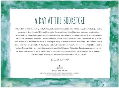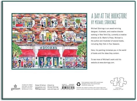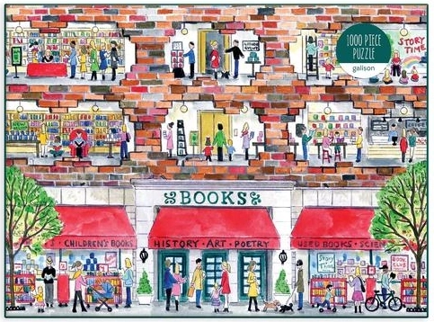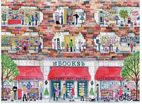 Puslespillet indeholder omhyggeligt udformede scener, der perfekt fanger stemningen i en boghandel og bylivet.
