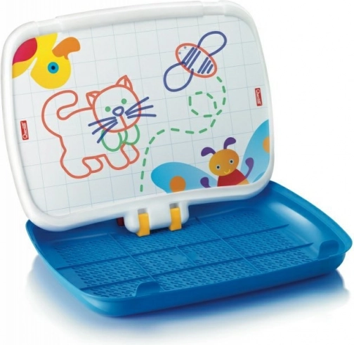 Pladen åbnes i en vinkel for komfortabel brug og fungerer også som låg. Ideel til tegning, skrivning og tidlig grafomotorik.